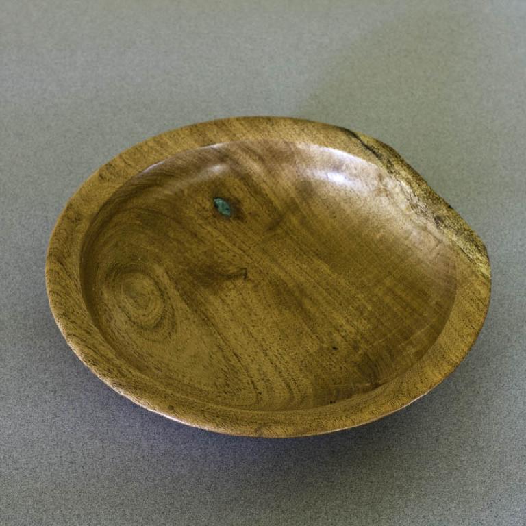 This wide, shallow bowl is of mesquite, native to southwestern U.S. A desert wood, mesquite usually has very interesting, cracks, and voids. In this bowl, the voids and small cracks are filled with crushed turquoise. 9 1/2" x 2". Free shipping.