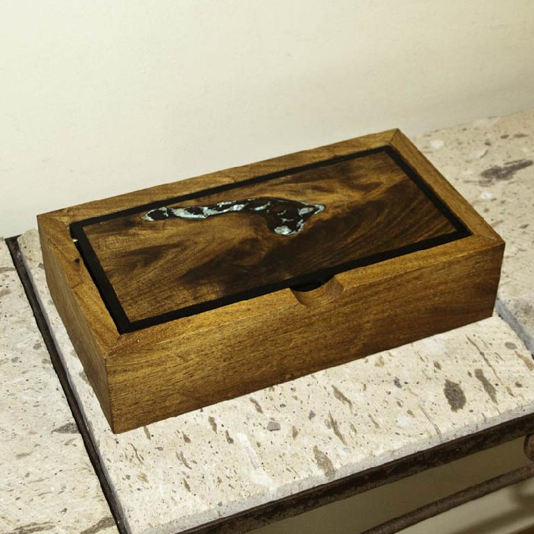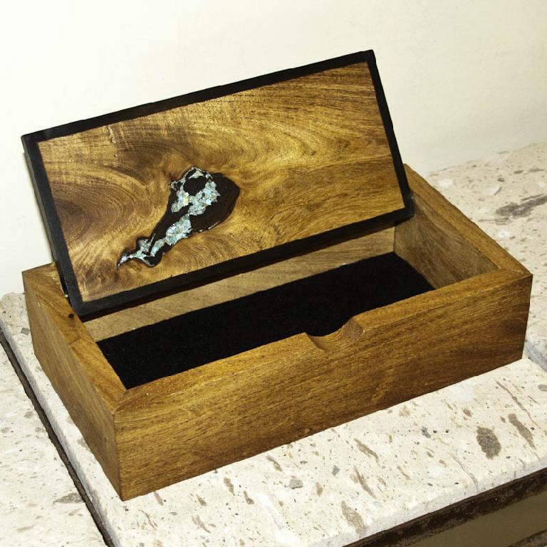 This jewelry box is of mesquite, a southwestern wood, with accents of turquoise and an ebony frame in the lid. The hinge is a simple brass pin. The box's finish has a polyurethane and oil base and an oil and wax topcoat. Inside, the bottom of the box is lined with black felt. The box measures 11⅜" x 6" x 2¾".